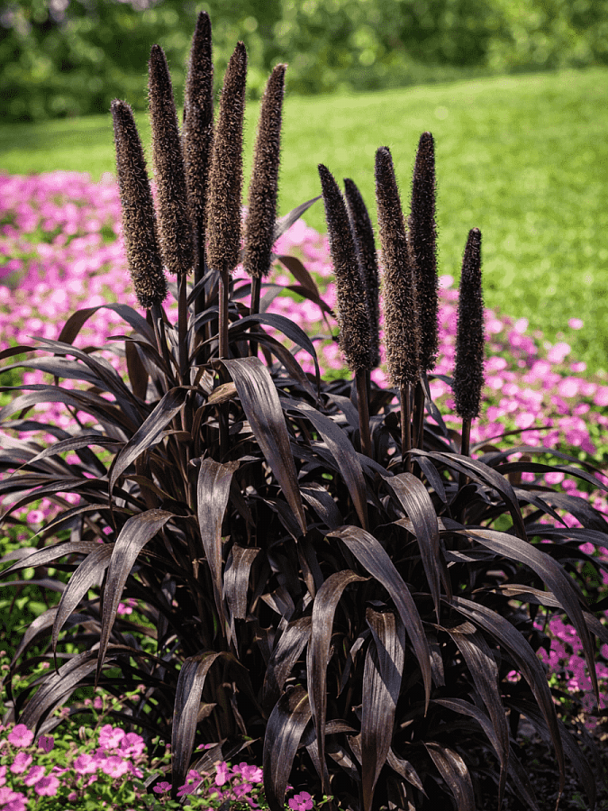 Пеннисетум Purple Baron - это великолепное растение с темно-пурпурной листвой, которое станет настоящим украшением вашего сада. Сорт пеннисетума отличается высотой от 75 до 150 см, что делает его идеальным выбором для альпинариев, групповых и одиночных посадок, а также для рокариев. Его стебли грациозно изгибаются, создавая неповторимый ландшафтный акцент. Листья имеют уникальную форму и цвет, придающий растению особую привлекательность.