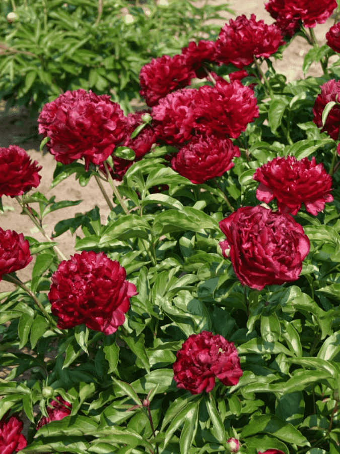 Рассада пиона молочноцветкового Хайлайт (Paeonia lactiflora Highlight) станет настоящей находкой для любителей этих прекрасных многолетних растений. В отличие от своих «собратьев» этот сорт совершенно не имеет аромата, но это вполне компенсируется его большими блестящими махровыми цветами с диаметром до 19 сантиметров. Глубокий темный красный цвет будет притягивать внимание, где бы вы ни посадили его ― одиночно или в групповой посадке с другими, контрастными по оттенку цветами. В последнем случае лучше размещать Хайлайт на заднем плане, так как высота куста может достигать одного метра.
