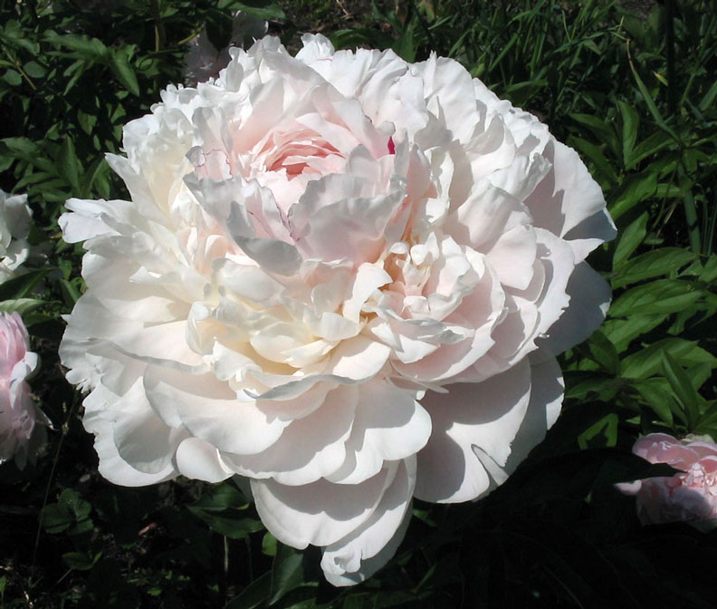 Саженцы пионов "Ник Шейлор" (Nick Shaylor) разрастаются медленно. Взрослый куст раскидистый, среднеоблиственный. Стебли прямые и прочные. Высота кустарника достигает от 60 до 70 см. Цветет многолетник с середины июня в течение 8-10 дней. Крупные, в диаметре могут достигать 22 см, густомахровые соцветия окрашены в бело-розовый цвет со светло-желтым отливом у основания лепестков. Аромат слабый и приятный. Саженцы пионов "Ник Шейлор" идеально подходит для создания ярких и оригинальных композиций.