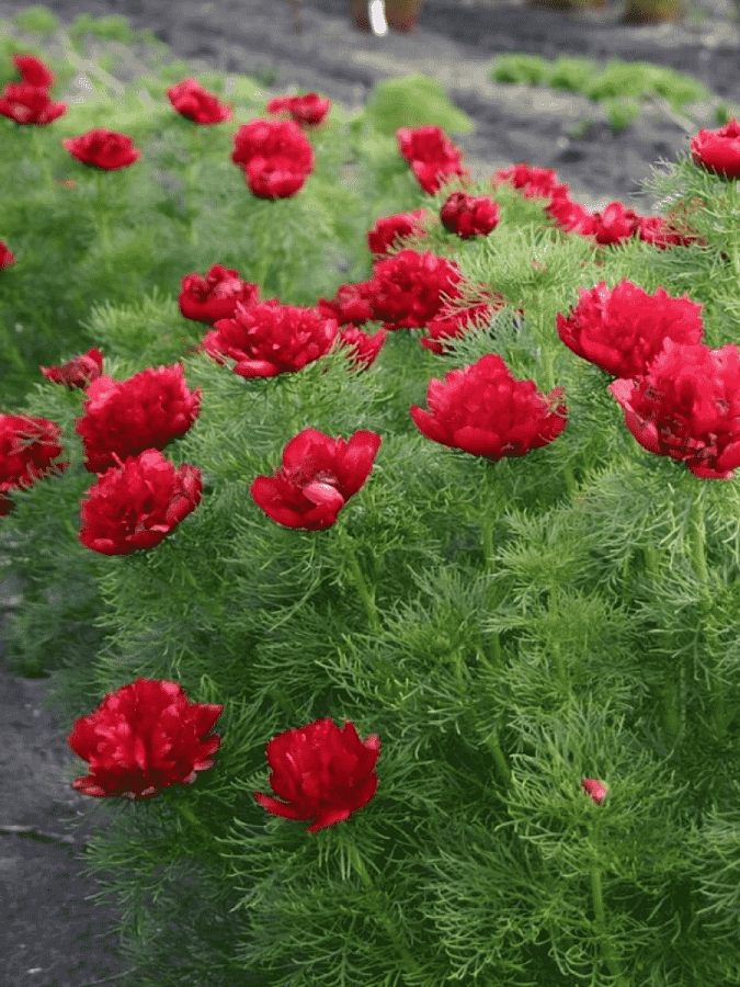 Пион тонколистный red umbrella - это великолепное растение с ярко-красными и тёмно-пурпуровыми цветками, которые поражают своей красотой. Этот сорт пиона отличается высотой от 20 до 50 см, что делает его идеальным выбором для групповых и одиночных посадок в саду. Листья пиона red umbrella имеют тонкую форму, что добавляет изящества этому растению.