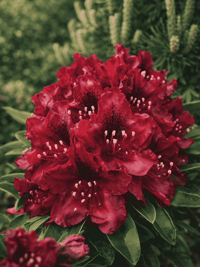 Рододендрон гибридный kali - это великолепное растение с пурпурно-красными цветками, которые расцветают в мае. Его высота может достигать до 100 см, а диаметр цветка составляет 7 см. Этот рододендрон отлично подходит для групповых и одиночных посадок, предпочитая полутень.