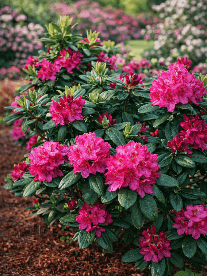 Рододендрон гибридный Pearce’s American Beauty - это великолепное растение с изящными листьями и яркими цветами. Его ствол прочный и устойчивый, а размеры растения позволяют использовать его как в групповых, так и в одиночных посадках. Листья растения имеют интересную форму и насыщенный зеленый цвет, что придает ему особый шарм.
