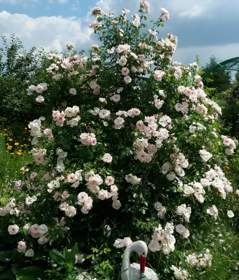 Саженцы розы плетистой Свон Лейк привлекают садоводов тем, что это повторноцветущий сорт, который цветет практически весь год. Крупные бутоны издают прекрасный аромат. Лепестков много, и они белого цвета с розовыми прожилками. Диаметр одного цветка достигает 9 см. Структура лепестков махровая и приятная на ощупь. На период зимы и весенних заморозков, побеги и корневую систему нужно укрывать, чтобы они не пострадали от низких температур. Первое время после посадки нужно проявлять к цветам повышенное внимание, поливать, удобрять органическими и минеральными удобрениями.