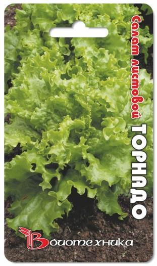 Семена салата "Торнадо" (Tornado) на рассаду высевают с марта по май. Прямо в открытый грунт посев осуществляют в мае – июне. Сорт среднеспелый, период от массовых всходов до технической спелости составляет 59-68 дней. Розетка приподнятая, диаметром 25-30 см и высотой 28-30 см. Лист короткочерешковый, крупный, в длину достигает 14-20 см, а в ширину 22-30 см, форма веерообразная с сильно выраженной волнистостью края. Вкусовые качества отличные, консистенция хрустящая. Сорт обладает продолжительным периодом хозяйственной годности, рекомендуется к потреблению в свежем виде.