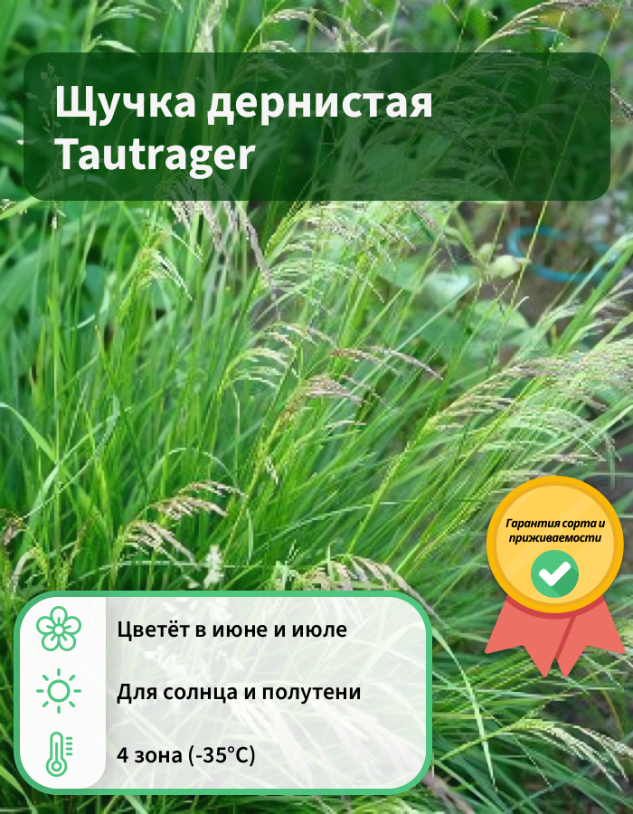 Рассада щучки дернистой Таутрагер (Tautrager) растёт на любых почвах. Цветёт в конце июня. Во время солнцепёка может покрыться ржавчиной. Замечательно себя чувствует в полутени. Меняет цвет по мере созревания. По высоте куст низкорослый – не превышает 90 см. В диаметре, в лучшем случае, около 60 см. Цветки имеют голубоватый оттенок, со временем приобретают жёлтый. Сочетается с цветами, имеющими другую форму, например, розами, лилейниками, эхинацеями и хостами.