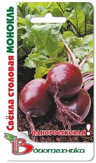 Семена свеклы "Монокль" (Monokl) принадлежат к одноростковому среднераннему сорту. Посев осуществляют в открытый грунт на плодородную почву, когда земля прогреется до 6-8 градусов тепла. Богатый урожай возможен при должном поливе. Сбор проводят на 60-65 день после появления всходов. Корнеплоды ровные, округлые, с высокими качествами мякоти, темно-красного цвета. Средняя масса варьируется от 300 до 350 грамм. Корнеплоды очень сладкие, богатые витаминами и различными полезными веществами. Сорт универсального назначения, хорошо хранится.