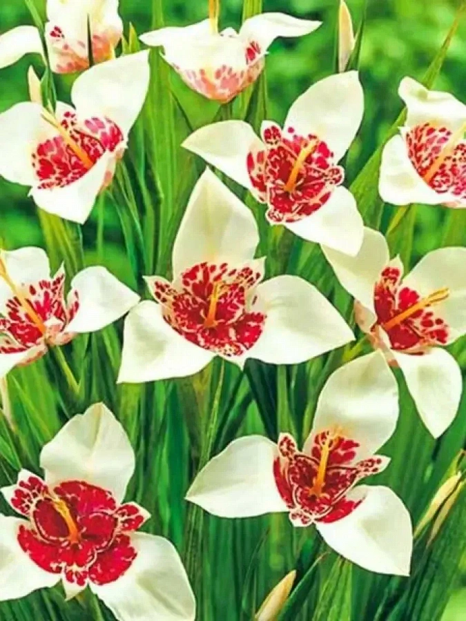 Луковицы Тигридии павлинии Вайт (White, Tigridia pavonia) обязательно стоит посадить в своем саду. За короткие сроки из них вырастут необыкновенные цветы, высота которых достигает до 45-50 сантиметров. Эффектные ланцетовидные листья и крепкие цветоносы сочного зеленого тона. Цветы с тонким и нежным ароматом, крупные диаметром до 15 сантиметров, с большими белоснежными лепестками, серединки цветков имеют пятнистую, тигровую окраску. Период цветения продолжительный с июля по октябрь. И несмотря на короткий период цветения каждого цветка (до 8 часов), сад будет благоухать тонкой аристократичной красотой тригидии, благодаря распусканию все новых и новых бутонов.