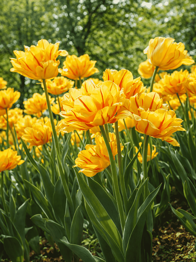 Тюльпан вырастает до 45-50 сантиметров. Цветоножка крепкая, хорошо выдерживает сильные ветра. Листья широкие, заостренные кверху. Бутоны оранжево-желтые с зелеными отметинами. Многочисленные лепестки окрашены в яркий желтый цвет, края – красные, на некоторых лепестках есть вертикальные красные штрихи.