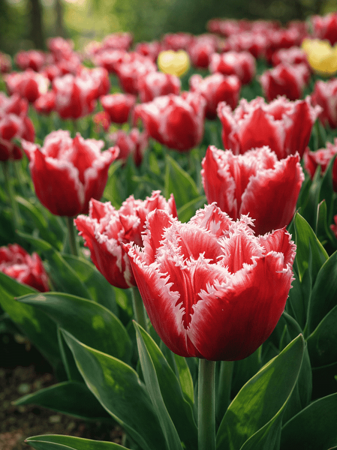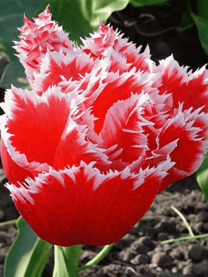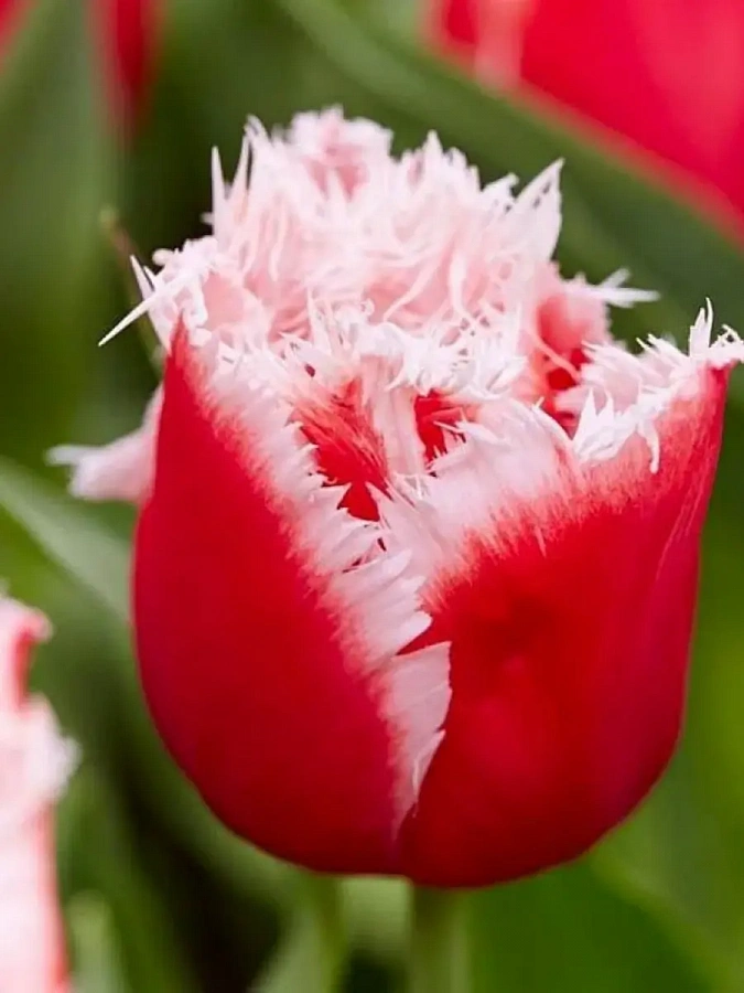 Луковицы тюльпана бахромчатого Канаста станут растением высотой около 55 сантиметров. На цветоносах, которые активно идут в рост весной, появляются крупные бокаловидные цветки с высотой бутона до 9 сантиметров. Удивителен их окрас: основным цветом является красный, а лепестки украшает густая и длинная белая зубчатая бахрома. Тюльпан Канаста будет эффектно смотреться на участке и сам по себе, но можно посадить его в составе смешанной клумбы с другими весенними цветами ― гиацинтами и нарциссами. Достаточно долго сохраняет свежесть в срезанном виде, поэтому используется для составления букетов.