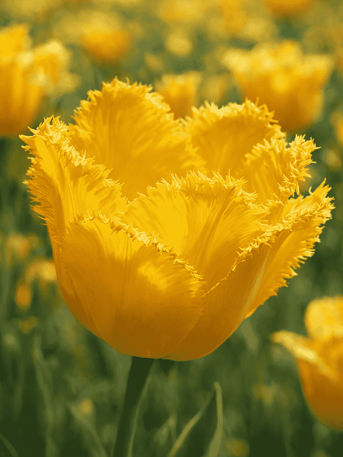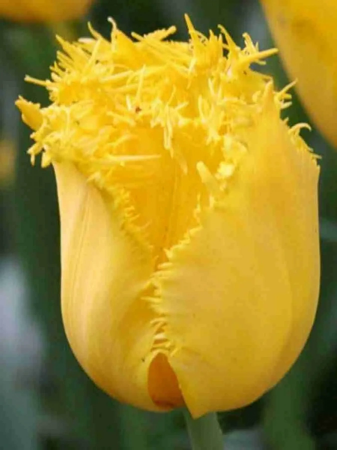 Тюльпан бахромчатый кристал стар - это великолепное растение с чисто желтыми цветками, украшенными кристаллической бахромой. Этот сорт тюльпанов отличается высотой до 40 см и цветением в мае-апреле, что позволяет создать яркий акцент в саду или на клумбе. Листья тюльпана зеленые, что придает растению свежий и естественный вид.