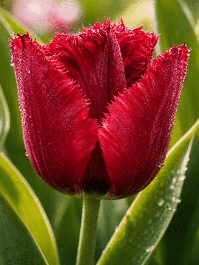 Тюльпан бахромчатый Версаче - это великолепное растение с рубиновыми цветками, которое поражает своей красотой и изяществом. Высота этого тюльпана может достигать до 40 см, что делает его идеальным выбором для групповых и одиночных посадок. Листья тюльпана имеют травянистую форму, а его стебель прочный и устойчивый.