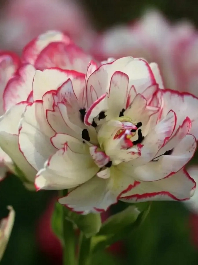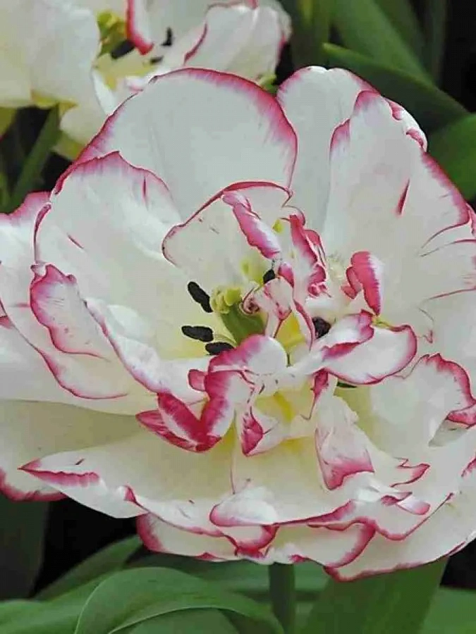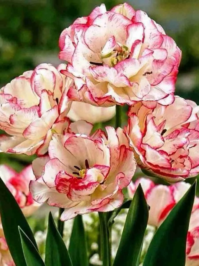 Тюльпаны этого сорта низкорослые – до 25-30 сантиметров в высоту. Листья – насыщенного зеленого цвета. Бутоны бокаловидные, распустившиеся цветы – полусферические, густомахровые. Бело-желтые цветки с рубиново-красной окантовкой распускаются в конце апреля и цветут около 1 месяца.