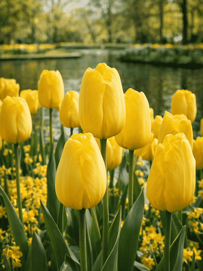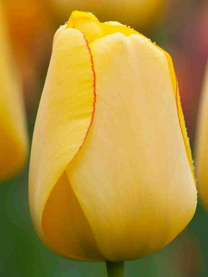 Луковицы тюльпана Голден Парад (Golden Parade) отлично подойдут для создания красивых клумб в конце апреля-мае. Растение высотой до 80 сантиметров цветет великолепным лимонным цветом с едва заметным красным напылением и каймой. Бокал крупный до 10 сантиметров.