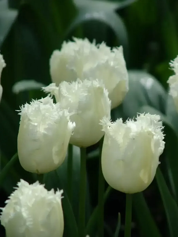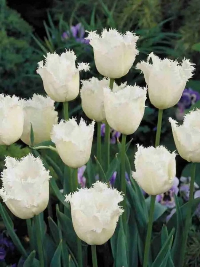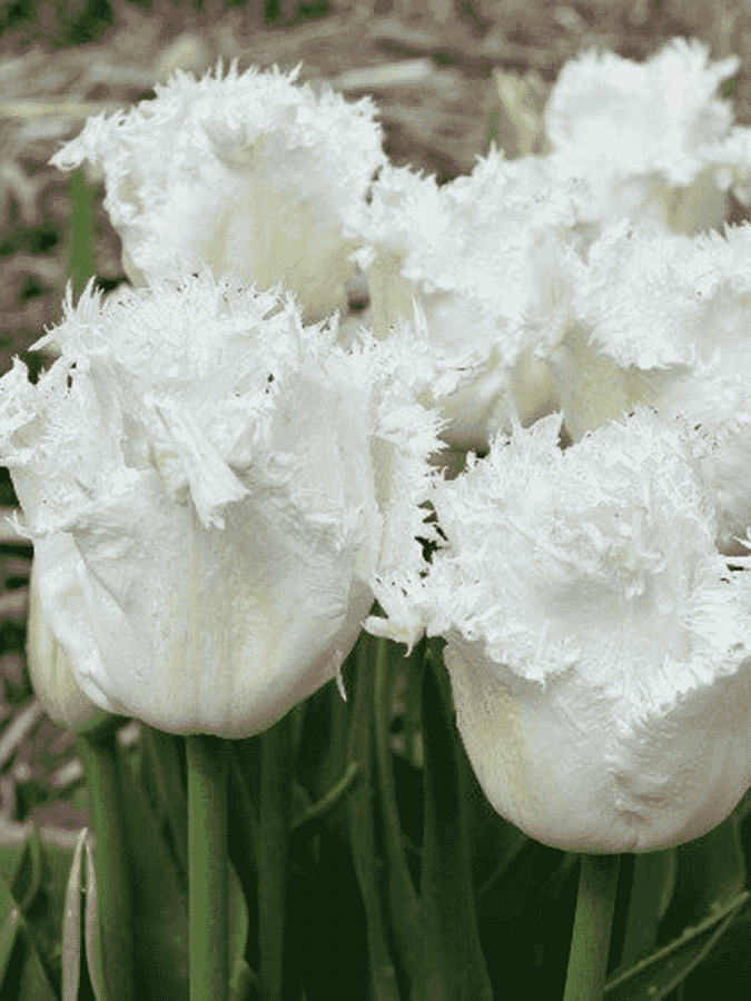 Луковицы тюльпана Ханимун (Tulipa Honeymoon) цветут крупными белыми цветками с пышной резной бахромой по краю каждого лепестка.