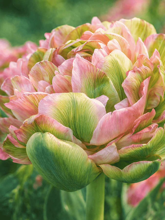 Тюльпан махровый double viri - это изысканное растение с неповторимой красотой. Его стебель прочный и устойчивый, достигает высоты до 40-45 см, что делает его идеальным для групповых и одиночных посадок. Листья тюльпана имеют ярко-зеленый цвет и создают прекрасный контраст с розовыми цветками, украшенными широким зеленым вертикальным мазком по центру.