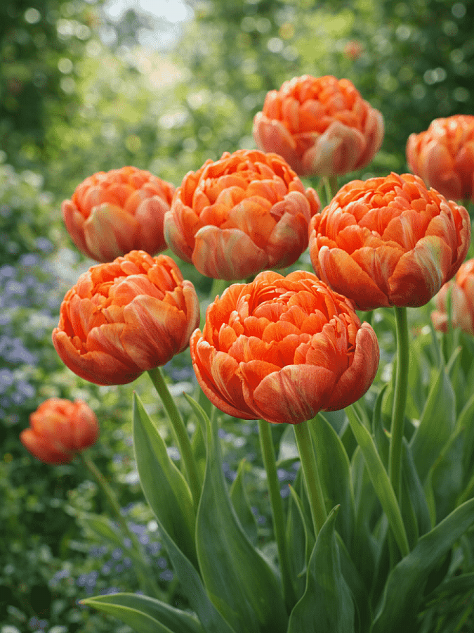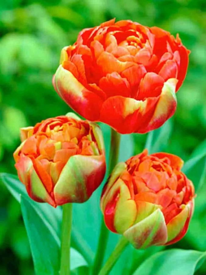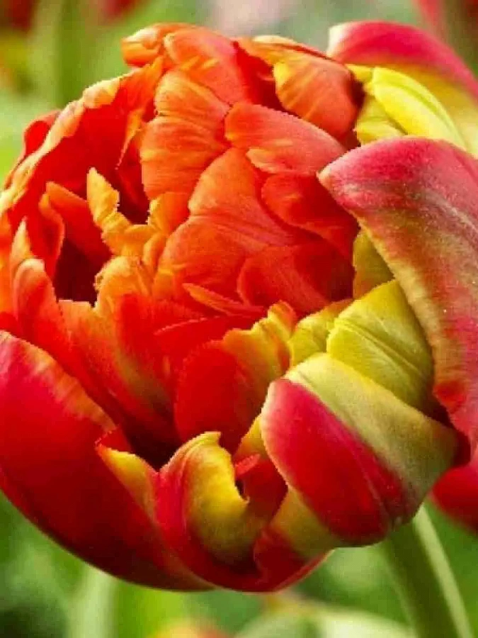 Тюльпан махровый princess unique - это великолепное растение с оранжево-красными цветками, украшенными нежно-зелеными мазками. Его стебель достигает высоты до 40 см, а размер цветка составляет 10-12 см. Цветение этого тюльпана наступает в мае, радуя глаз своими яркими оттенками.