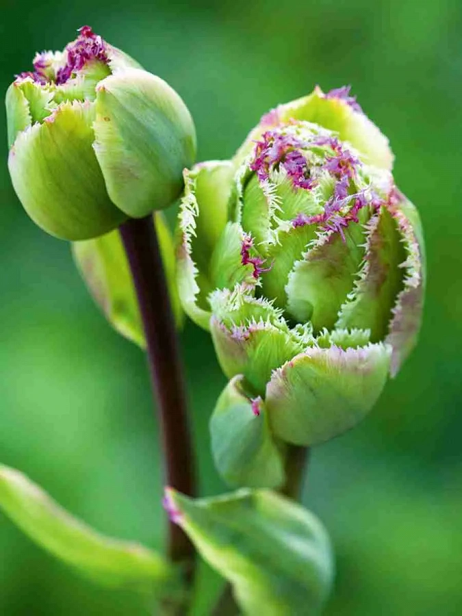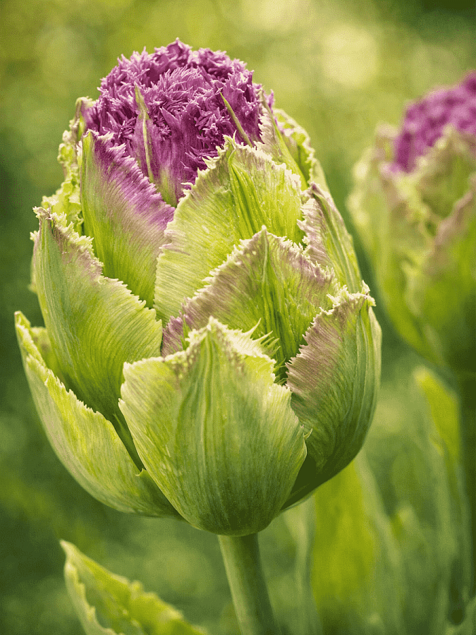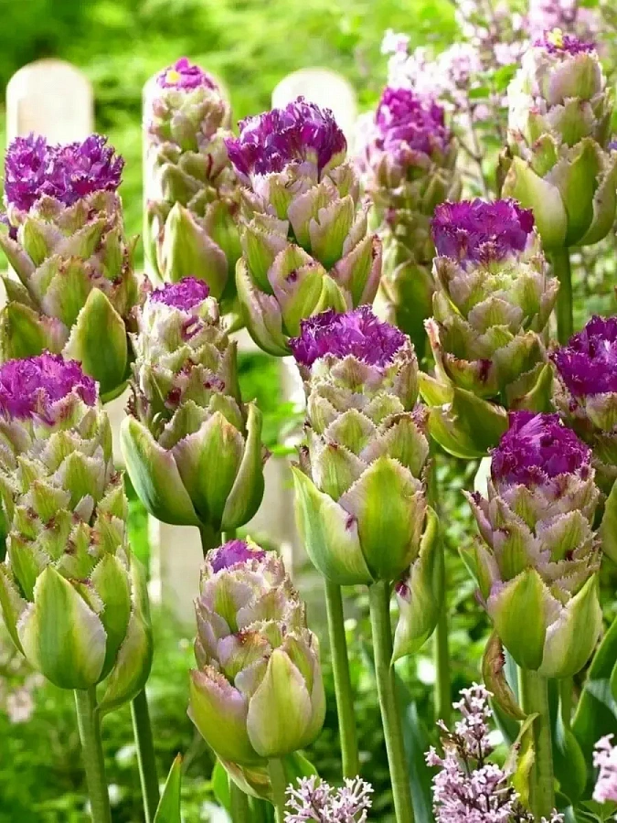 Тюльпан махровый Purple Tower - это великолепное растение с изысканным цветком, окрашенным в зеленые тона с сиреневой бахромой по краям. Его стебель достигает высоты до 50 см, что делает его идеальным выбором для групповых и одиночных посадок. Этот тюльпан предпочитает солнечные места и легко переносит морозы, что делает его отличным выбором для садов в Московской области и других регионах с зоной морозостойкости 4.