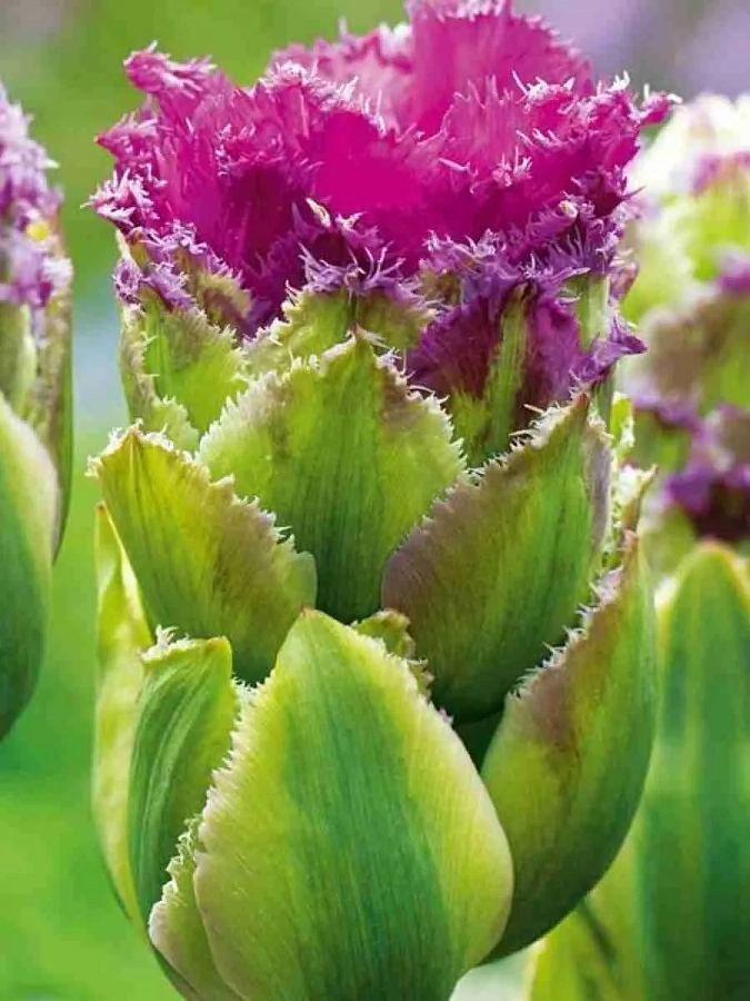 Окраска цветка : зеленая, по краям которых присутствует сиреневая бахрома