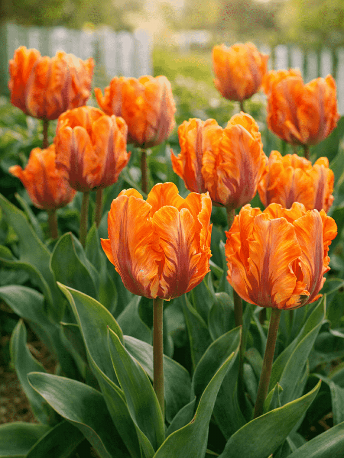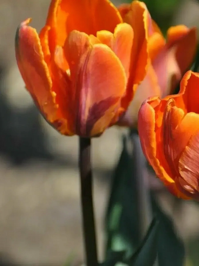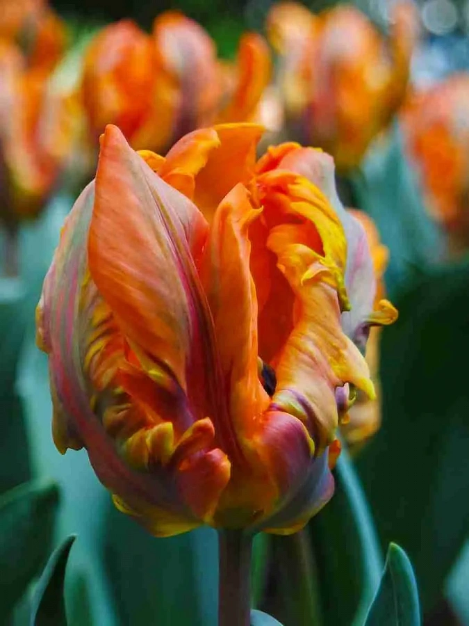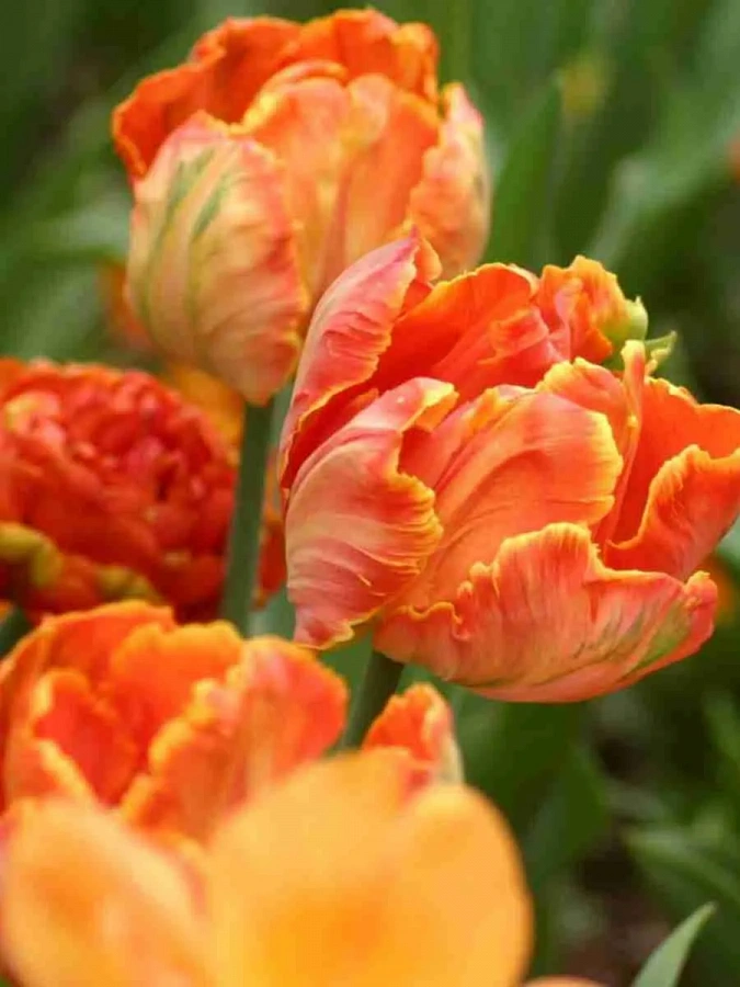 Тюльпан orange rococo - это великолепное растение с оранжевыми цветками, украшенными фиолетовой продольной полосой. Этот сорт тюльпанов поражает своей красотой и изяществом. Стебель тюльпана прочный, достигает высоты до 35 см, что делает его идеальным для групповых и одиночных посадок. Листья тюльпана orange rococo имеют классическую форму и придают растению особый шарм.