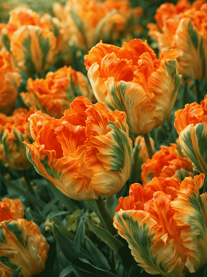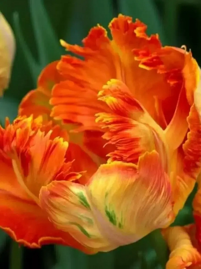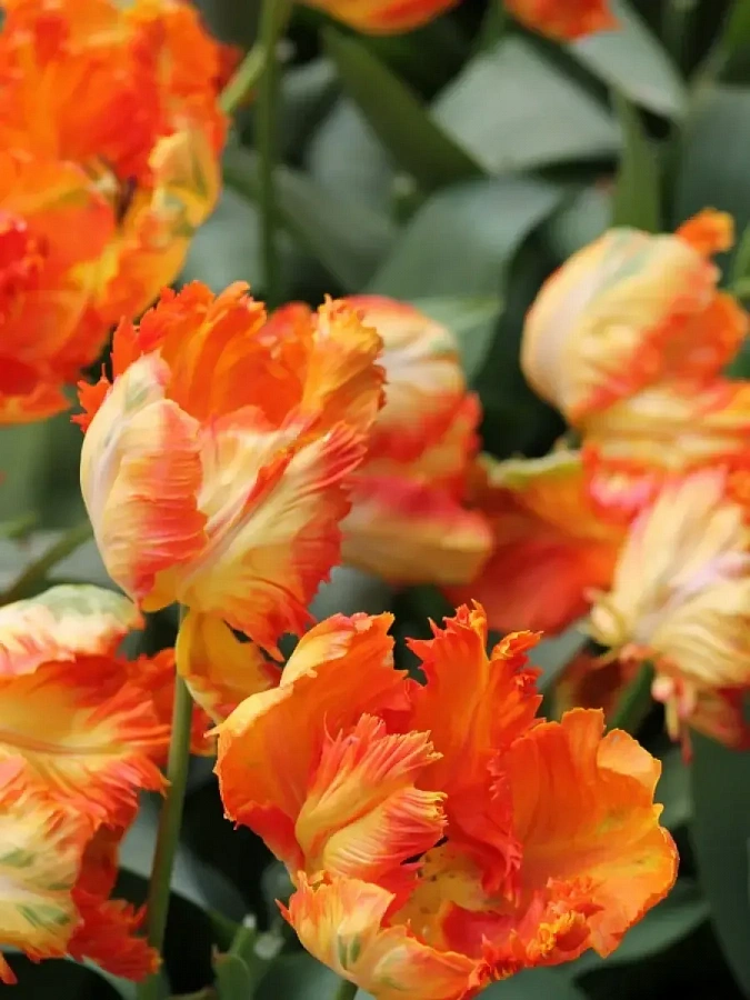 Тюльпан Parrot King - это великолепное растение, которое поразит вас своей красотой и изысканностью. Его стебель прочный и прямой, достигает высоты до 50-60 см, а цветки величиной от 10 до 20 см украшены яркими оттенками белого, оранжевого и зеленого. Этот сорт тюльпана цветет в мае, радуя глаз своими необычными формами и насыщенными цветами.