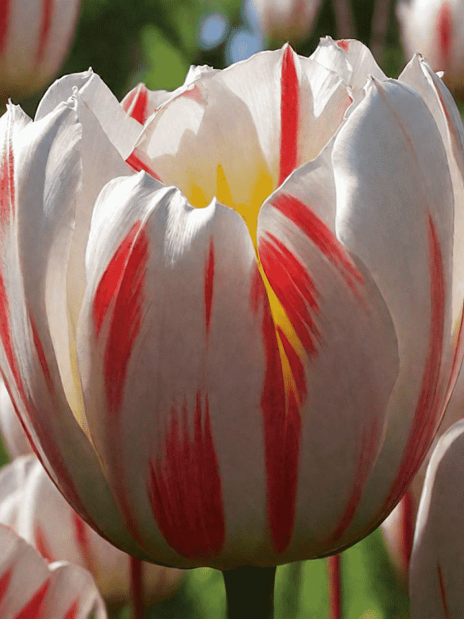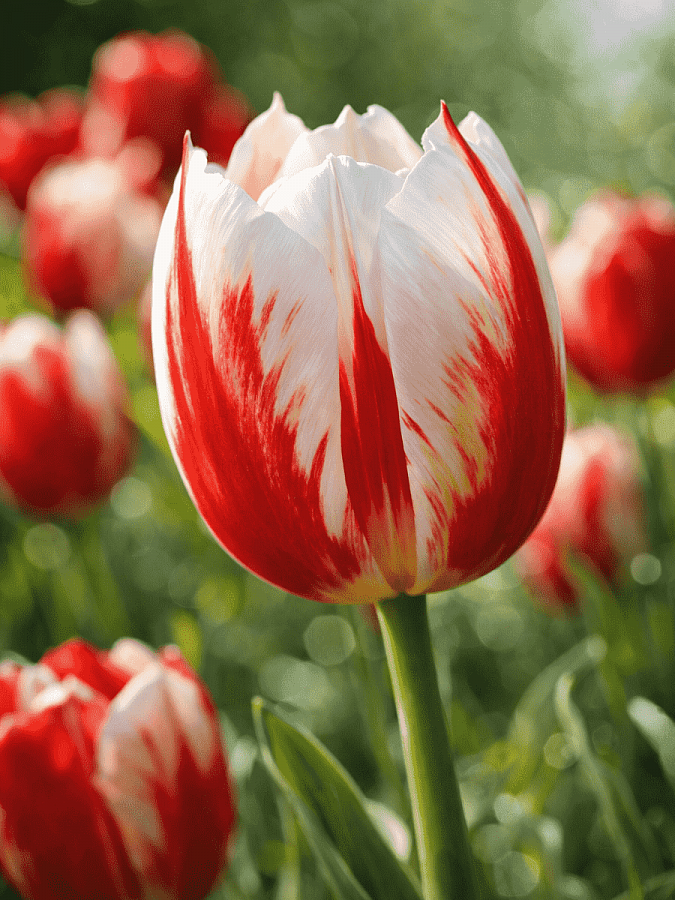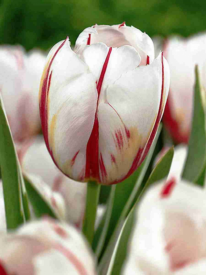 Тюльпан Триумф Хэппи Дженерейшн - это великолепное растение с белыми цветками, украшенными красными и жёлтыми штрихами. Его стебель достигает высоты до 50 см, что делает его идеальным выбором для групповых и одиночных посадок. Листья тюльпана имеют травянистую форму, а его цветы радуют глаз в мае и апреле.