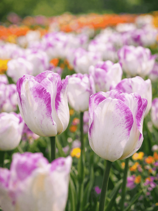 Луковицы тюльпана Ширли (Shirley) дают великолепные растения с экзотическим белым в нежно-лиловых-пятнышках бокалом с белым дном и лиловым краем. Этот сорт называют «хамелеон». Растение высотой 45-50 сантиметров. Бокал правильной формы, высотой до 7 сантиметров.
