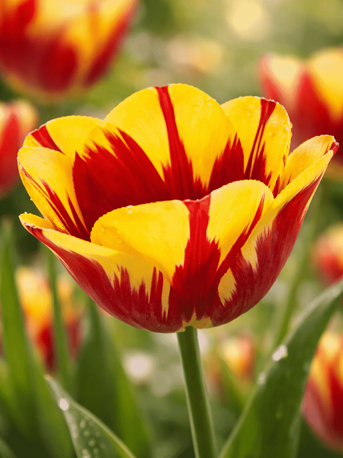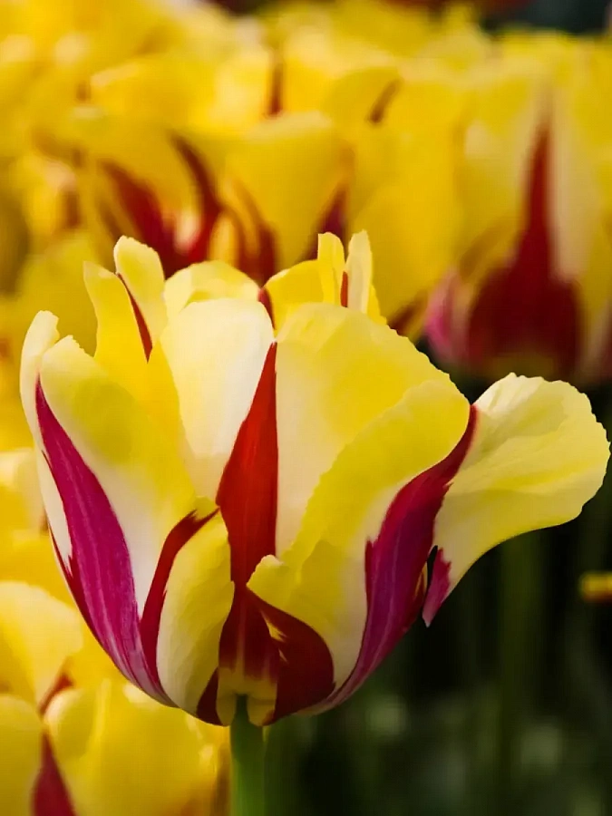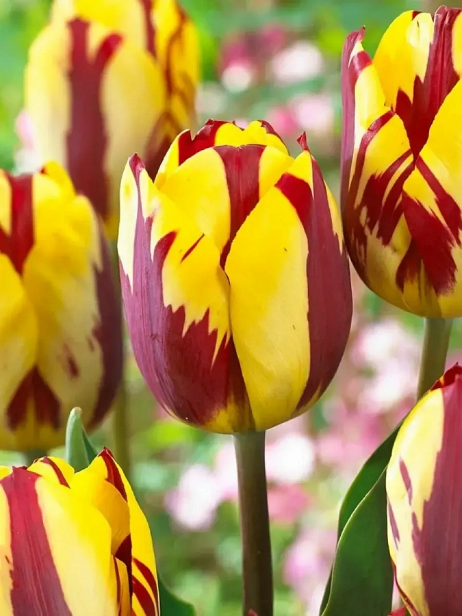 Тюльпан Twister - это настоящий художник среди цветов! Его желтые лепестки украшены широкими малиново-красными мазками, создавая неповторимый вихрь красок. Этот сорт тюльпана поражает своей красотой и изяществом, привлекая взгляды и завораживая своим уникальным цветением в мае.