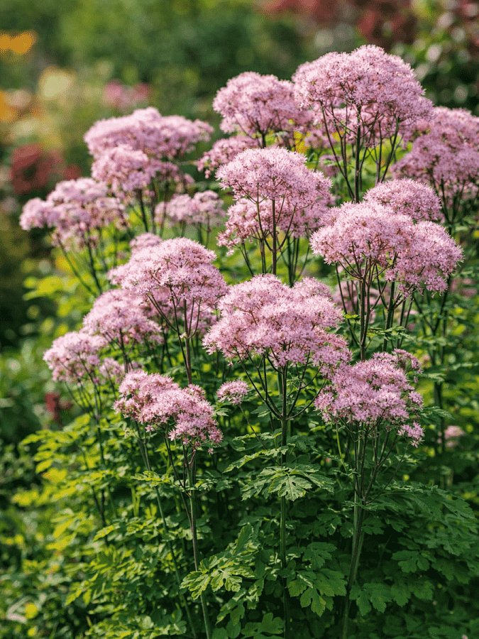 Василистник Delavayi Nimbus Pink - это изысканное растение с серебристо-лавандово-розовыми цветками, которые расцветают в октябре и апреле. Его стебель достигает высоты до 100 см, что делает его идеальным для групповых и одиночных посадок в саду. Листья василистника имеют уникальную форму и отличаются нежным оттенком, придавая растению особый шарм.