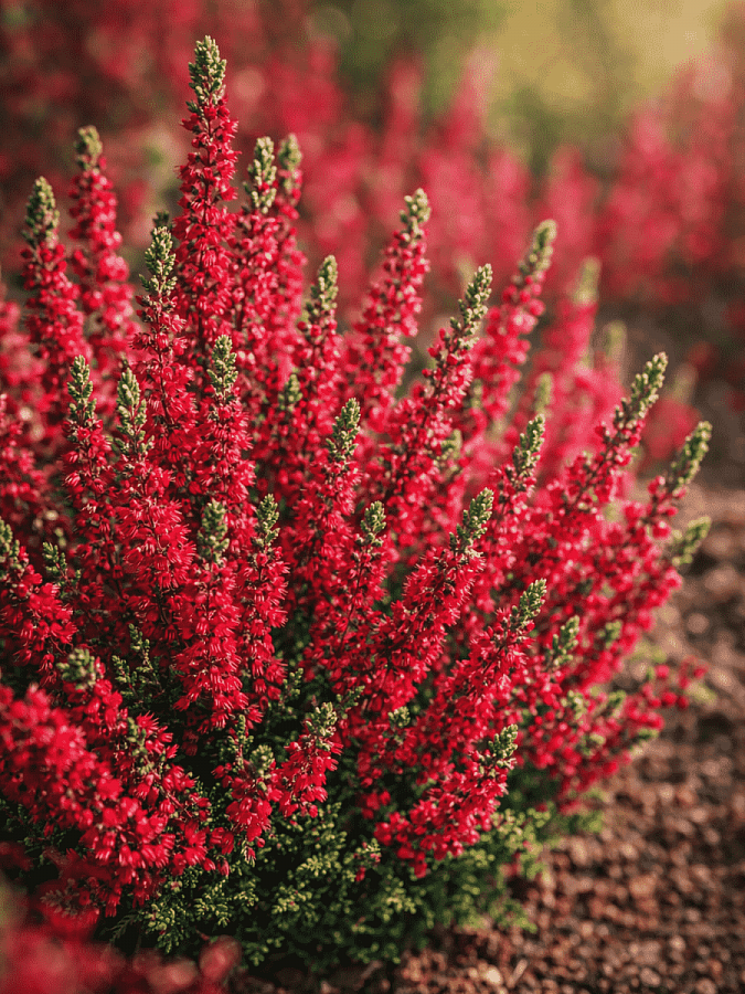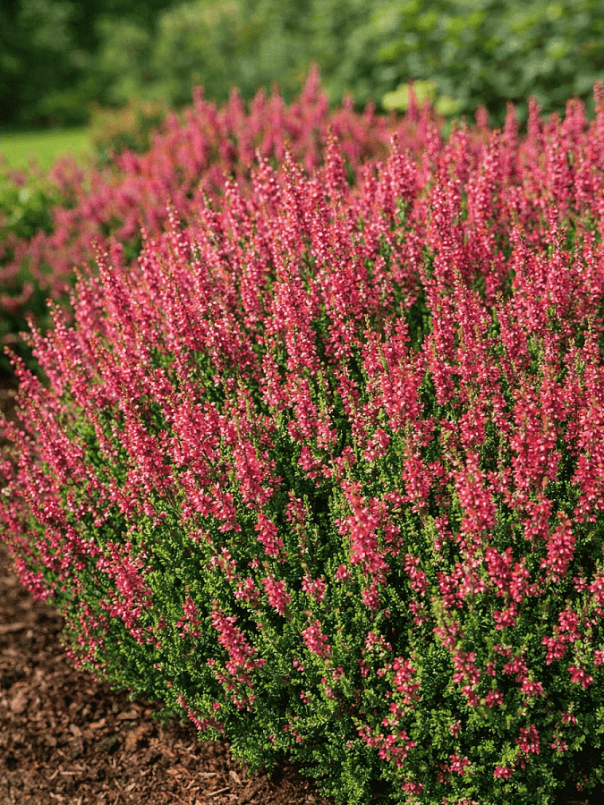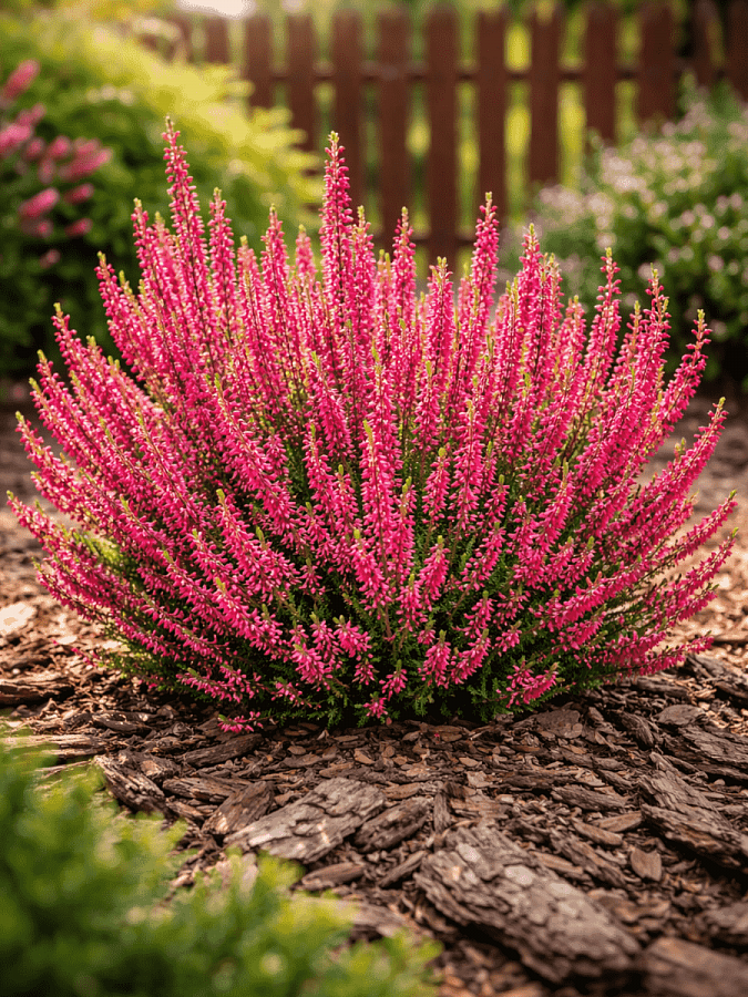 Вереск Дарк Бьюти используют для высадки на альпийскую горку, где яркие соцветия эффектно смотрятся на фоне белых камней. Сорт теплолюбив, поэтому на зиму почву под растениями укрывают толстым слоем мульчи.