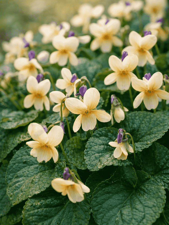 Листья виолы зеленые, создавая прекрасный контраст с цветами. Растение предпочитает солнечные места, поэтому выберите хорошо освещенное место для его посадки. Виола sulphurea не требует сложного ухода: достаточно регулярного полива и умеренного удобрения.