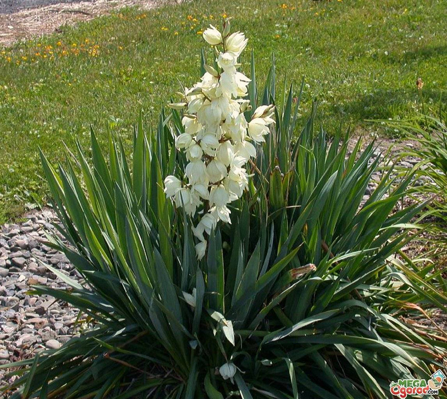 Саженцы юкки нитчатой – вне конкуренции, так как это бесстебельное растение, имеет сизо-зеленые листья,длинной 70 см и желтоватые цветы,размер которых 8 см,собранные в пышное соцветие, достигающее двухметровой высоты.